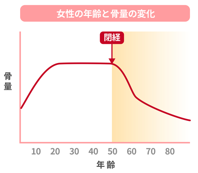 閉経による女性ホルモン(エストロゲン)の急減が、骨粗しょう症の大きな引き金になります。骨密度が急速に低下しやすく、50歳以降の女性に多い病気とされています。